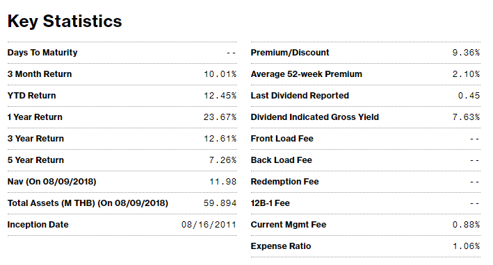 看名字就知道主要是投資泰國高息股票,對於不熟悉泰國股市但對泰國長遠看好的投資者,不妨考慮一下,算是一個安全穩妥的投資泰國懶人包,按BLOOMBERG網站的資料顯示,現價的息率超過7%,比起近期不斷爆煲的P2P,肯定穩妥不少。