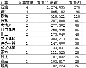 泰國的上市企業一向是分紅比較慷慨,可以看到有幾家企業,比如泰國國家石油(PTT)、泰國石油(THAI OIL)、還有幾家銀行股及電訊股,息率都相當吸引,總體來說,這25家企業的平均分紅息率為2.7%。