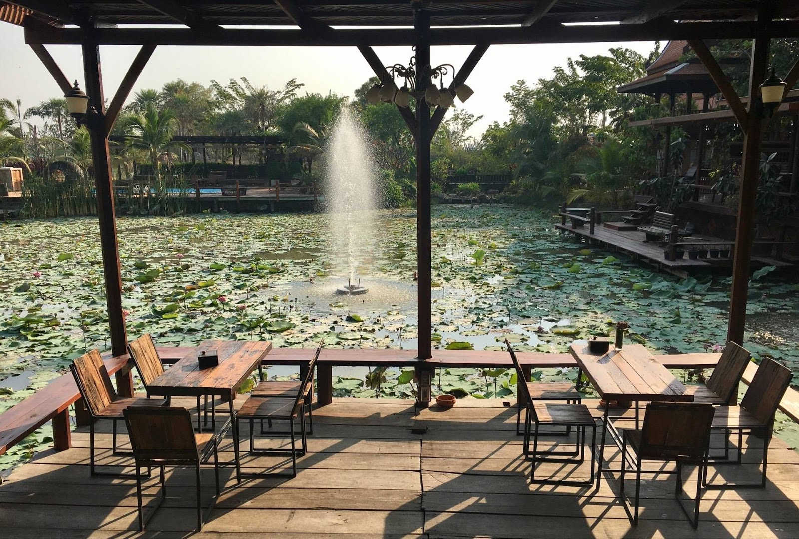 最有特色的是酒店的餐廳正對著一個蓮花池,屋頂還安裝了一個酒水系統,降溫之餘,還能聽著流水聲,坐在木秋千上看著蓮花池,非常漂亮,用餐也特別開胃。