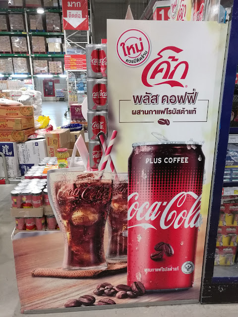 今天在MAKRO買菜,見到一張非常醒目的廣告牌,原來是咖啡+可樂,其實也搞不清究竟是可樂味咖啡還是咖啡味可樂了,不過估計提神效果不錯,其實在日本去年已經有售,大家到泰國有興趣也可以試一下!